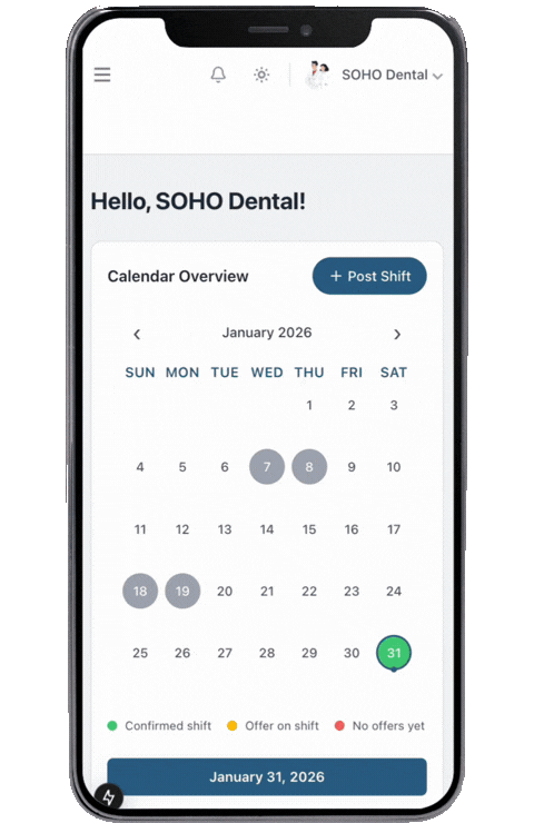 Create and post dental temp shifts in minutes. Set dates, hours, and requirements, then receive applications from available hygienists and dental nurses.